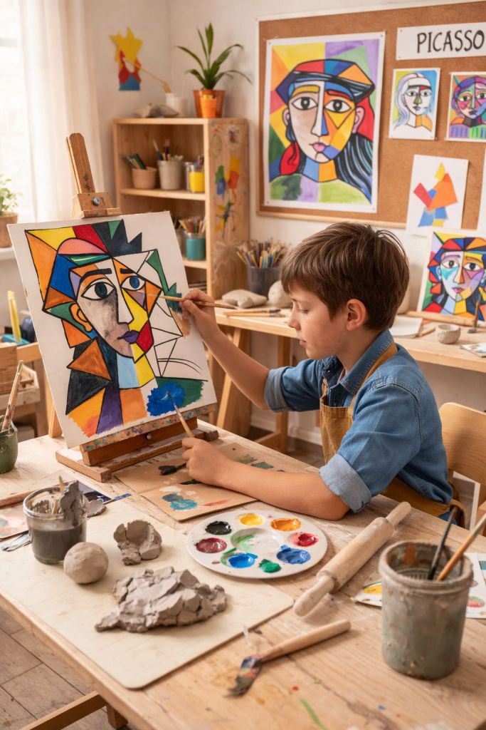Esta semana hemos estado trabajando a Pablo Picasso en la escuela, no solo como un gran artista si no como alguien valiente, decidido, que se atrevió a mirar el mundo y la vida desde muchos ángulos al mismo tiempo. Alguien que rompía la forma porque la entendía.